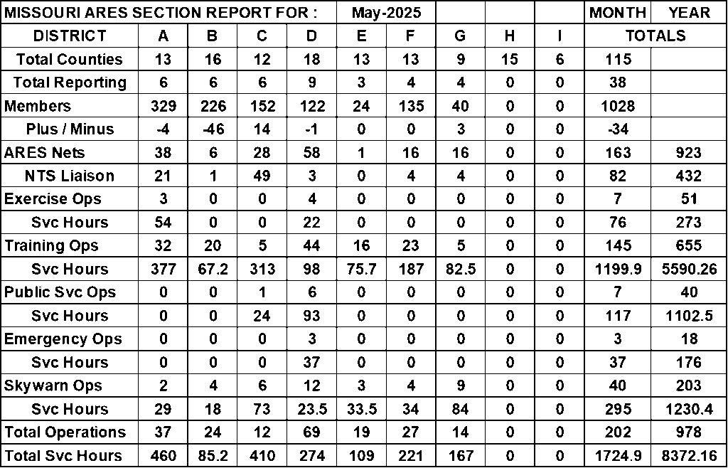 The following is the activities and volunteer hours reported for the month of May in the Missouri Section. 39 ECs reported out of 60 and all 7 DECs reported.