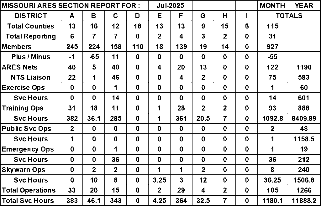 Summer is passing quickly and October will be here before we know it. October is Simulated Emergency Test (SET) month. This a a great opportunity to practice your emcomm skills. I hope the ARES groups is the Missouri Section are planning exeercises.